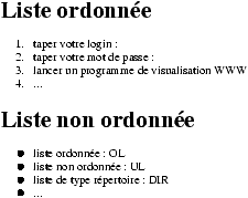 1 <UL> 2 <LI> liste ordonnée : OL </LI> 3 <LI> liste non ordonnée : UL </LI> 4 <LI> liste de type répertoire : DIR </LI> 5 <LI> ... </LI> 6 </UL>